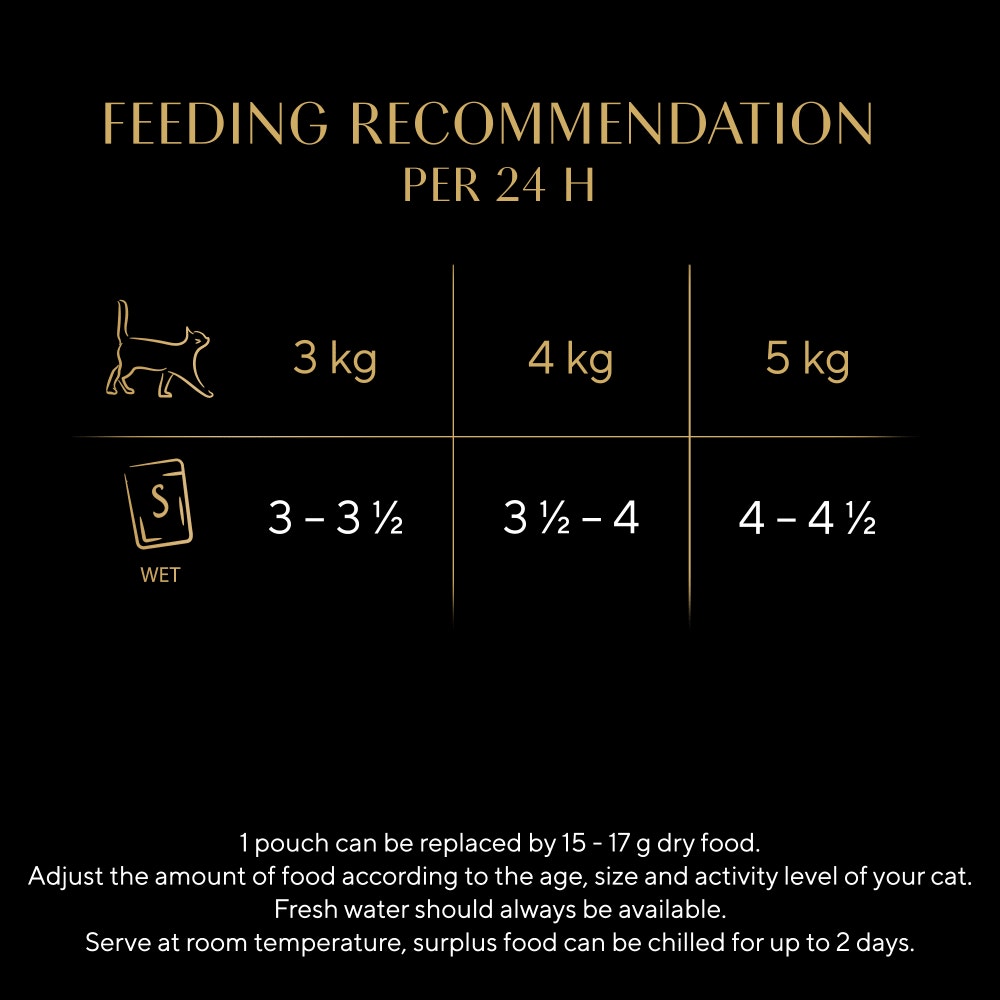 With Duck Analytical constituents (%): Protein: 7.5, Fat content: 4.5, Inorganic matter: 1.5, Crude fibre: 0.20, Moisture: 86.0, Additives per kg:, Flavourings;, Nutritional additives:, Vitamin D₃: 213 IU, Taurine: 572 mg, Copper (Copper(II) sulphate pentahydrate): 1.3 mg, Iodine (Calcium iodate, anhydrous): 0.34 mg, Iron (Iron(II) sulphate monohydrate): 17.0 mg, Manganese (Manganous sulphate, monohydrate): 3.4 mg, Zinc (Zinc sulphate, monohydrate): 16.0 mg, Technological additives:, Cassia gum: 1457 mg With Chicken Analytical constituents (%): Protein: 7.5, Fat content: 4.5, Inorganic matter: 1.5, Crude fibre: 0.20, Moisture: 86.0, Additives per kg:, Flavourings;, Nutritional additives:, Vitamin D₃: 213 IU, Taurine: 572 mg, Copper (Copper(II) sulphate pentahydrate): 1.3 mg, Iodine (Calcium iodate, anhydrous): 0.34 mg, Iron (Iron(II) sulphate monohydrate): 17.0 mg, Manganese (Manganous sulphate, monohydrate): 3.4 mg, Zinc (Zinc sulphate, monohydrate): 16.0 mg, Technological additives:, Cassia gum: 1457 mg With Poultry Analytical constituents (%): Protein: 7.5, Fat content: 4.5, Inorganic matter: 1.5, Crude fibre: 0.20, Moisture: 86.0, Additives per kg:, Flavourings;, Nutritional additives:, Vitamin D₃: 213 IU, Taurine: 572 mg, Copper (Copper(II) sulphate pentahydrate): 1.3 mg, Iodine (Calcium iodate, anhydrous): 0.34 mg, Iron (Iron(II) sulphate monohydrate): 17.0 mg, Manganese (Manganous sulphate, monohydrate): 3.4 mg, Zinc (Zinc sulphate, monohydrate): 16.0 mg, Technological additives:, Cassia gum: 1457 mg With Turkey Analytical constituents (%): Protein: 7.5, Fat content: 4.5, Inorganic matter: 1.5, Crude fibre: 0.20, Moisture: 86.0, Additives per kg:, Flavourings;, Nutritional additives:, Vitamin D₃: 213 IU, Taurine: 572 mg, Copper (Copper(II) sulphate pentahydrate): 1.3 mg, Iodine (Calcium iodate, anhydrous): 0.34 mg, Iron (Iron(II) sulphate monohydrate): 17.0 mg, Manganese (Manganous sulphate, monohydrate): 3.4 mg, Zinc (Zinc sulphate, monohydrate): 16.0 mg, Technological additives:, Cassia gum: 1457 mgFEEDING GUIDELINES