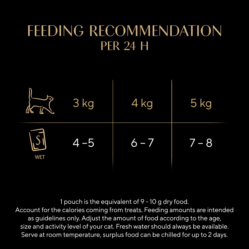 Analytical constituents (%): Protein: 7.5, Fat content: 4.5, Inorganic matter: 1.4, Crude fibre: 0.30, Moisture: 85.0, Additives per kg:, Nutritional additives:, Vitamin D3: 198 IU (Vitamin D3 not supplemented in salmon and tuna varieties), Taurine: 530 mg, Copper (Copper(II) sulphate pentahydrate): 1.2 mg, lodine (Calcium iodate, anhydrous): 0.32 mg, Iron (Iron(II) sulphate monohydrate): 15.8 mg, Manganese (Manganous sulphate, monohydrate): 3.2 mg, Zinc (Zinc sulphate, monohydrate): 14.8 mg, Technological additives:, Cassia gum: 1704 mgFEEDING GUIDELINES