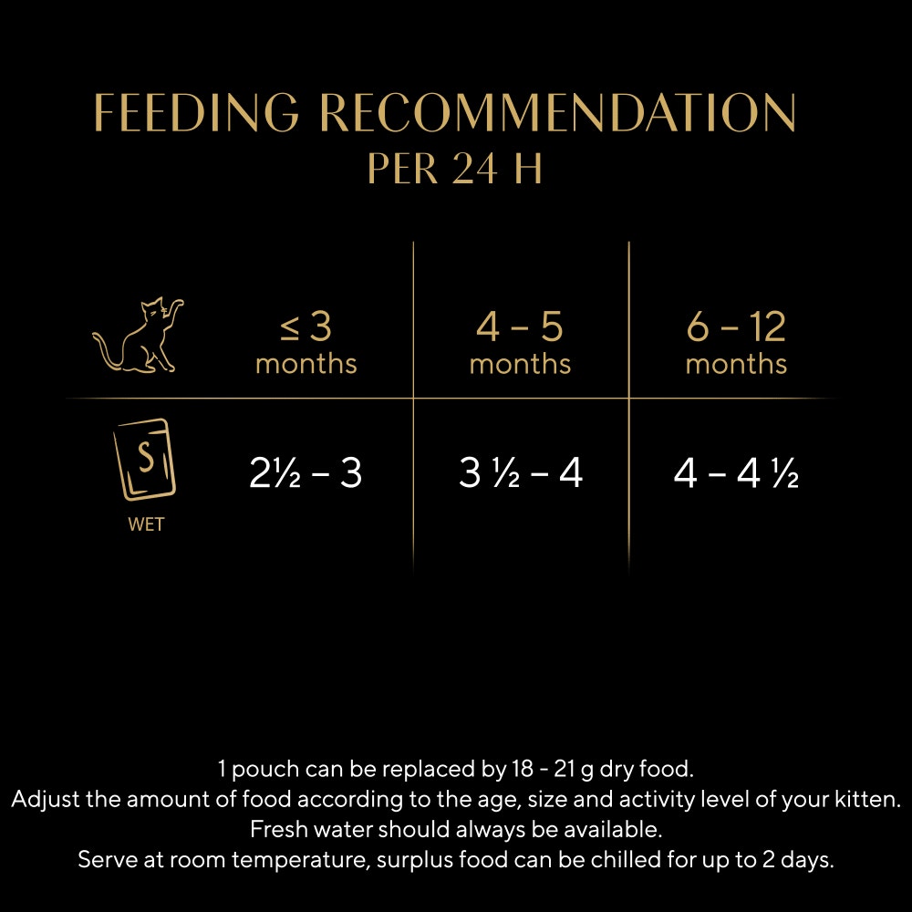 Analytical constituents (%): Protein: 8.0, Fat content: 5.7, Inorganic matter: 1.8, Crude fibre: 0.50, Moisture: 82.5, Calcium: 0.32, Phosphorus: 0.23, Additives per kg:, Nutritional additives:, Vitamin D₃: 245 IU (Vitamin D₃ not supplemented in 'salmon' variety), Vitamin E: 13.7 mg, Taurine: 1470 mg, Copper (Copper(II) sulphate pentahydrate): 1.5 mg, Iodine (Calcium iodate, anhydrous): 0.34 mg, Iron (Iron(II) sulphate monohydrate): 17.1 mg, Manganese (Manganous sulphate, monohydrate): 3.4 mg, Zinc (Zinc sulphate, monohydrate): 15.9 mgFEEDING GUIDELINES