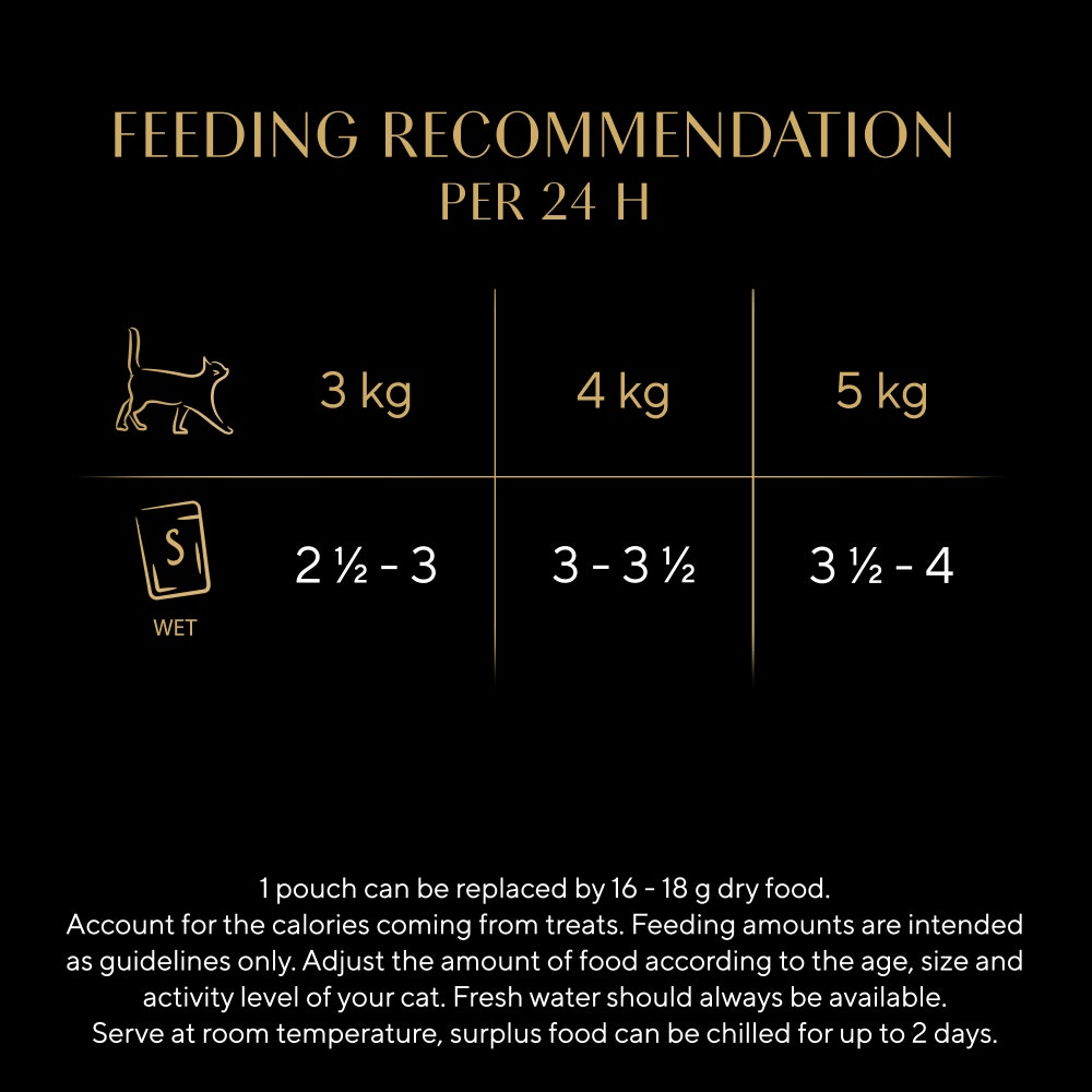 With Beef Analytical constituents (%): Protein: 7.5, Fat content: 4.5, Inorganic matter: 1.5, Crude fibre: 0.20, Moisture: 85.0, Additives per kg:, Flavourings;, Nutritional additives:, Vitamin D₃: 213 UI, Taurine: 572 mg, Copper (Copper(II) sulphate pentahydrate): 1.3 mg, Iodine (Calcium iodate, anhydrous): 0.34 mg, Iron (Iron(II) sulphate monohydrate): 17.0 mg, Manganese (Manganous sulphate, monohydrate): 3.4 mg, Zinc (Zinc sulphate, monohydrate): 16.0 mg With Chicken Analytical constituents (%): Protein: 7.5, Fat content: 4.5, Inorganic matter: 1.5, Crude fibre: 0.20, Moisture: 85.0, Additives per kg:, Flavourings;, Nutritional additives:, Vitamin D₃: 213 UI, Taurine: 572 mg, Copper (Copper(II) sulphate pentahydrate): 1.3 mg, Iodine (Calcium iodate, anhydrous): 0.34 mg, Iron (Iron(II) sulphate monohydrate): 17.0 mg, Manganese (Manganous sulphate, monohydrate): 3.4 mg, Zinc (Zinc sulphate, monohydrate): 16.0 mg With Lamb Analytical constituents (%): Protein: 7.5, Fat content: 4.5, Inorganic matter: 1.5, Crude fibre: 0.20, Moisture: 85.0, Additives per kg:, Flavourings;, Nutritional additives:, Vitamin D₃: 213 UI, Taurine: 572 mg, Copper (Copper(II) sulphate pentahydrate): 1.3 mg, Iodine (Calcium iodate, anhydrous): 0.34 mg, Iron (Iron(II) sulphate monohydrate): 17.0 mg, Manganese (Manganous sulphate, monohydrate): 3.4 mg, Zinc (Zinc sulphate, monohydrate): 16.0 mg With Turkey Analytical constituents (%): Protein: 7.5, Fat content: 4.5, Inorganic matter: 1.5, Crude fibre: 0.20, Moisture: 85.0, Additives per kg:, Flavourings;, Nutritional additives:, Vitamin D₃: 213 UI, Taurine: 572 mg, Copper (Copper(II) sulphate pentahydrate): 1.3 mg, Iodine (Calcium iodate, anhydrous): 0.34 mg, Iron (Iron(II) sulphate monohydrate): 17.0 mg, Manganese (Manganous sulphate, monohydrate): 3.4 mg, Zinc (Zinc sulphate, monohydrate): 16.0 mgFEEDING GUIDELINES