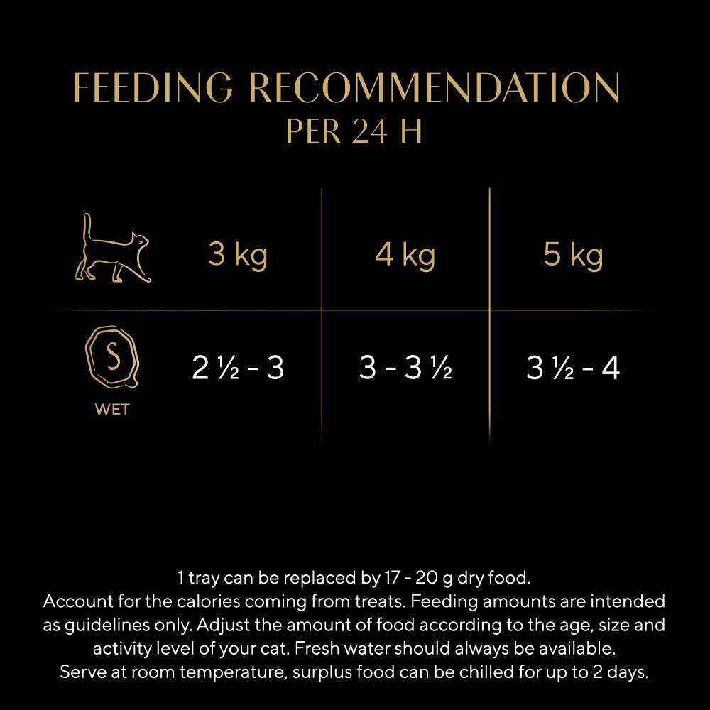 Analytical constituents (%): Protein: 8.0, Fat content: 5.0, Inorganic matter: 1.8, Crude fibre: 0.20, Moisture: 83.0, Additives per kg:, Flavourings, Nutritional additives:, Vitamin D₃: 200 IU (Vitamin D₃ not supplemented in fish varieties), Taurine: 620 mg, Copper (Copper(II) sulphate pentahydrate): 1.3 mg, Iodine (Calcium iodate, anhydrous): 0.34 mg, Iron (Iron(II) sulphate monohydrate): 16.8 mg, Manganese (Manganous sulphate, monohydrate): 3.4 mg, Zinc (Zinc sulphate, monohydrate): 16.2 mgFEEDING GUIDELINES